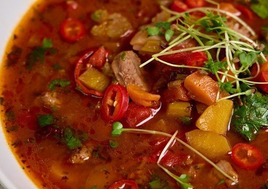 iskra Zverejnené 30. Apríl, 2025 Zverejnené 30. Apríl, 2025 Polievka Charčo Ingrediencie: 400g Hovädzie mäso Olivový olej Soľ Farebné korenie Tymián 1kus Cibuľa 1kus Mrkva oranžová 1kus Mrkva žltá 1kus Čili paprička 2 Strúčiky cesnaku 1 Pohár svetlé pivo Mletá paprika 1,5l Hovädzí vývar 400g Lúpané paradajky 2 Bobkové listy 1PL Sušené brusnice 120g Ryže Majorán Petržlenová vňať Postup: Mäso nakrájame na menšie kocky. V hrnci rozpálime olej a opečieme mäso. Osolíme, okoreníme, pridáme tymián. Keď mäso zhnedne, vyberieme na tanier a odložíme bokom. Do hrnca doplníme trošku oleja a orestujeme cibuľu. Pridáme očistenú a nakrájanú mrkvu, petržlen, zeler a čili papričku. Restujeme 10 minút, potom pridáme cesnak a po minúte zalejeme pivom. Keď nám tekutina takmer vyvrie, vrátime späť dohrnca opečené mäso. Vmiešame mletú papriku, zalejeme vývarom, pridáme lúpané paradajky, bobkový list, brusnice. Za občasného miešania varíme približne ešte 10 minút. Vsypeme ryžu, majorán a varíme, kým ryža nezmäkne. Polievku dosolíme, dokoreníme a vmiešame nasekanú petržlenovú vňať. 1