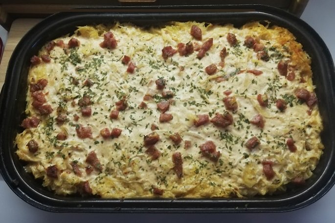 A túto nedeľu sme mali bravčové pláty prekladané slaninkou, cibuľou a kyslou kapustou, a k tomu pečené krumple. Bol toho plný pekáč...dalo by sa to jesť aj s knedľou, ale to sa mi nechcelo robiť.