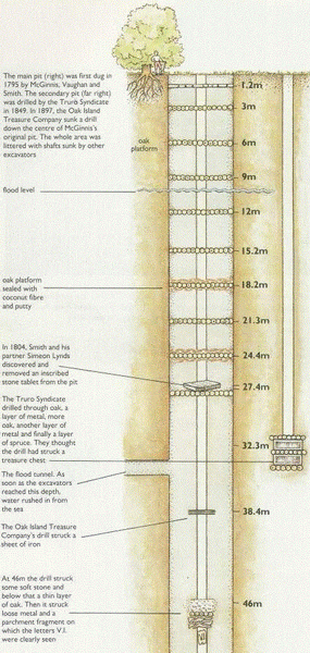 Hĺbka 3-6-9 metrov: Keď sa to isté opakuje znovu v 6. a tiež v 9. metroch, mladíci to vzdávajú, ale tajomstvo im nedá spať. Spoja sa s bohatým Simeonom Lyndom a v roku 1804 sa na ostrov vrátia, ale znovu každé tri metre narazia na drevo prehradzujúce jamu.