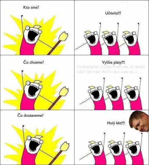 Vilma Flinstonova Zverejnené 2. December, 2012 Zverejnené 2. December, 2012 rada by som vedela, ako by sa štát (je jedno, pod akou vládou, lebo žiadna vláda po 1989 učiteľom nepriala), postavil k tomu, ak by všetci učitelia hromadne dali výpoveď.Zaujímavé by bolo aj to, keby tú výpoveď dali aspoň tí, ktorí učia v sťažených podmienkach, kde chcú rušiť osobitné školy/triedy...viem, že to je nereálne, ale predstava je to zaujímavá : koho by tam potom dosadili. páni, čo roba rozhodnutia od stolov, by šli učiť do osád či na iné miesta, kde vyžadujú od učiteľov priam nadľudské výkony?