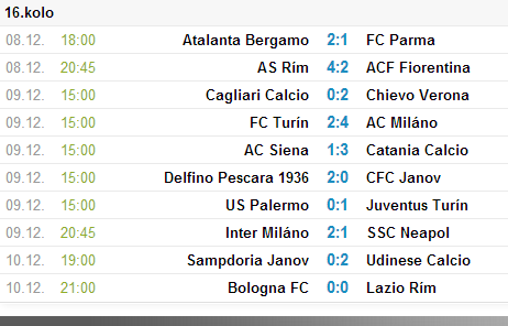 game Zverejnené 19. December, 2012 Zverejnené 19. December, 2012 18. kolo 21 decembra 18:00 Pescara vs Catania 1:2 20:45 Cagliari vs Juventus 1:2 22 decembra 12:30 Inter vs janov 2:1 15:00 Bologna vs Parma 2:1 15:00 Palermo vs Fiorentina 1:2 15:00 Torino vs Chievo 2:1 15:00 Siena vs Napoli 2:1 15:00 Sampdoria vs Lazio 1:2 15:00 Atalanta vs Udinese 1:1 20:45 Roma vs Milan 1:2