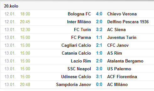 game Zverejnené 21. Február, 2013 Zverejnené 21. Február, 2013 26. kolo 23. februára 2013 20:45 Palermo vs Janov 1:2 24. februára 2013 12:30 Sampdoria vs Chievo 1:1 15:00 Bologna vs Fiorentina 1:2 15:00 Atalanta vs Roma 1:2 15:00 Cagliari vs Torino 1:2 15:00 Juventus vs Siena 2:1 15:00 Parma vs Catania 1:1 20:45 Inter vs Milan 1:2 25. februára 2013 19:00 Udinese vs Napoli 1:2 21:00 Lazio vs Pescara 2:1