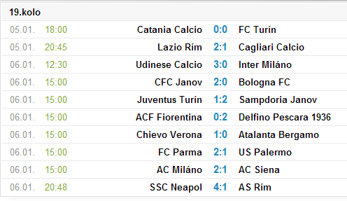 lopata555 Zverejnené 30. Január, 2013 Zverejnené 30. Január, 2013 23.kolo - 1.-3.2.2013 1.február 2013: 20:45 - Roma vs. Cagliari 2.február 2013: 18:00 - Torino vs. Sampdoria 20:45 - Napoli vs. Catania 3.február 2013: 12:30 - Chievo vs. Juventus 15:00 - Palermo vs. Atalanta 15:00 - Pescara vs. Bologna 15:00 - Siena vs. Internazionale 15:00 - Genoa vs. Lazio 15:00 - Fiorentina vs. Parma 20:45 - Milan vs. Udinese