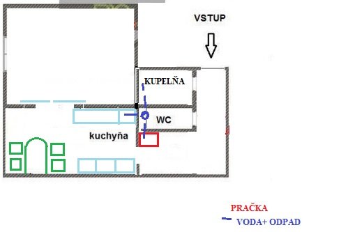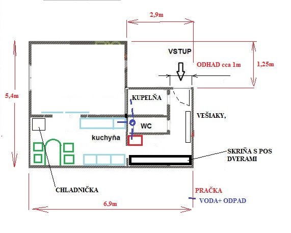 alarm Zverejnené 11. December, 2016 Zverejnené 11. December, 2016 Návrh vychádza z čiste technického hladiska. Všetky prípojky vodo a odpad sú situované tak, aby sa nešlo krížom cez byt.1)Kuchynská linka: voda a odpad su tam, kde boli, ide to poza linku do pôvodného odpadu, aj voda je len predlžená popri stene.2)WC ostáva na mieste, a je predpoklad, že práve za WC je odpadová rúra.3)Kúpelňa je na druhej strane WC. Je jedno, s ktorej strany je odtok a prívody vody.4)Pračka možno vôjde do kúpelne , záleží či vaňu ,alebo sprchovací kút. Ak by bola v chodbe, opäť nie je problém napojiť na odpad WC a prívod vody. Do pravého spodného kutu ,smerom ku kuchyni by som asi dal na celú stenu vstavanú skriňu. Rozmerovo to vyzerá po prepočte asi takto: