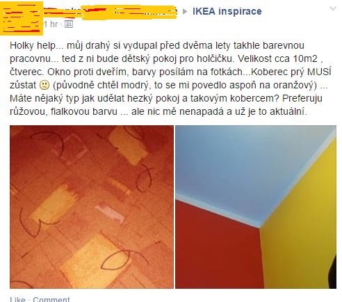 game Zverejnené 5. Január, 2015 Autor Zverejnené 5. Január, 2015 jedna veľmi pekná výstavná farebná perlička ... je to na pomedzí: miestnosť bola zmenená, pred nedávnym časom, a miestnosť znovu čaká zmena, čiastočná,ale za istých podmienok ...takto nejako to vyzerá, keď sa idú zraziť dva svety ... zostáva len dúfať, že to nebohé dítě nakoniec unikneoranžovému kobercu s ružovými a fialkovými stenami ...a jeho duševný život prebehne v pohode a estetické cítenie nezdedí po rodičoch ... :( žiadosť o radu pochádza z FB spolku Ikea inspirace, druhotne nyx.cz