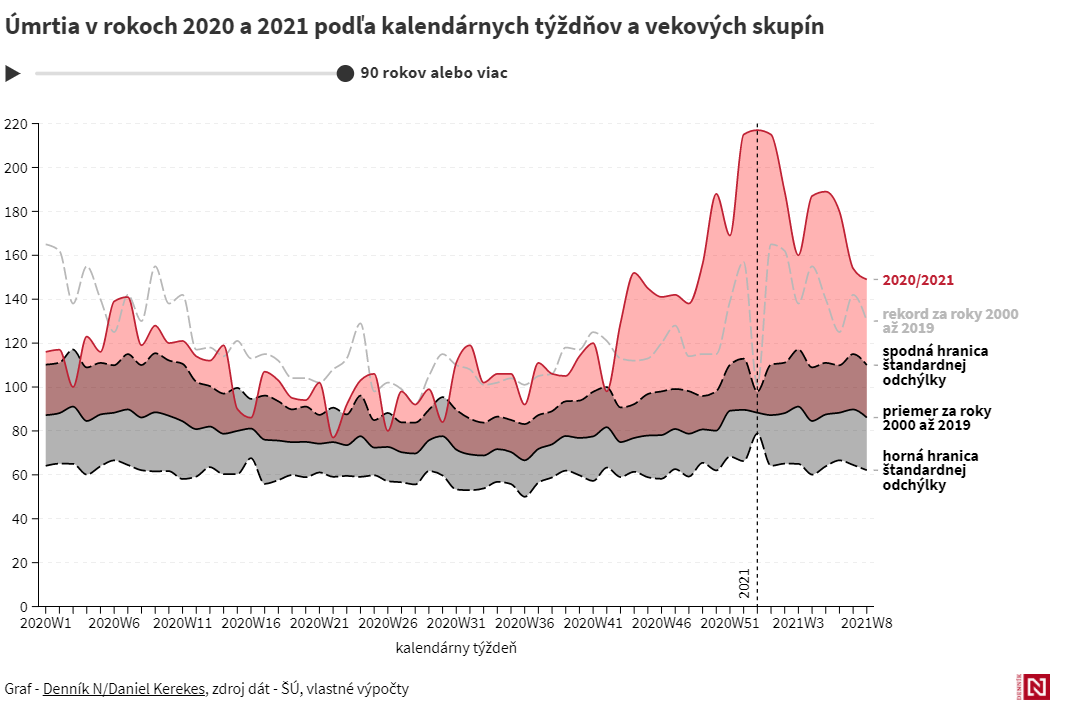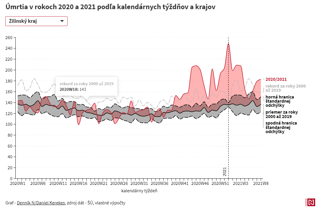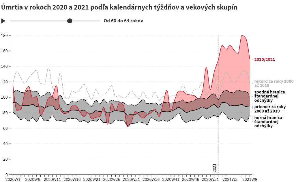 Vysiel clanok o umrtiach. Neviem ci vidite ten prvotny graf za cele slovensko. Tak poslednych 12 mesiacov(to by malo byt od 19.10) do konca roku 2020 umieralo v priemere tyzdenne 1400 ludi(moj odhad z grafu) a 8 tyzdnov v roku 2021 po 2000. Priemer za roky 2000-2019 to bolo cca 1050 ludi. Teda na Slovensku za to obdobie(20 tyzdnov) umrelo 32 800 ludi, bezny priemer je 21000.