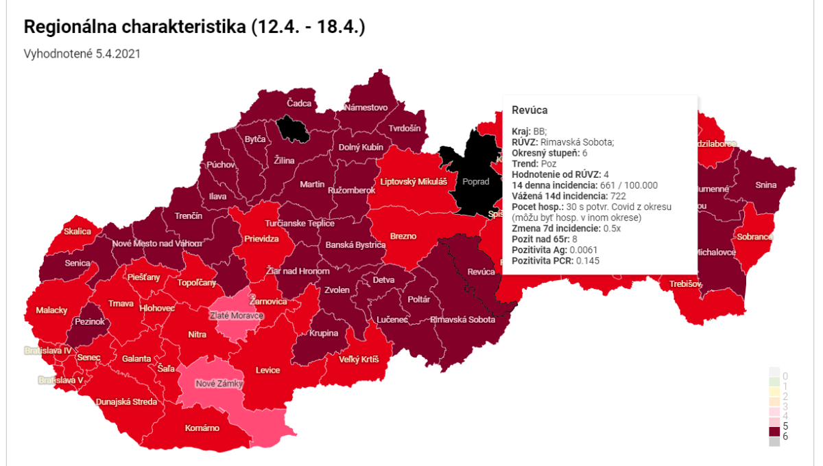 Vcera som si pocital na AG testoch Revuca mala za posledne 2 tyzdne 161 pozitivnych a 39 PCR testoch. Teda na na 100 000 prenasobis 2,5 a vyjde okruhla 500. Uz minulytyzden sme mali od regionalneho UVZ hodnotenie 4. A ostali sme v 6. Revuca mala vcera  0 PCRs polu este 5 okresmi), toto mala za posledne dva tyzdne asi 4 krat(boli sviatky). Teda jediny parameter,ze sme v 6,moze byt ak vzrastol pocet hospitalizovanych nad 40.
