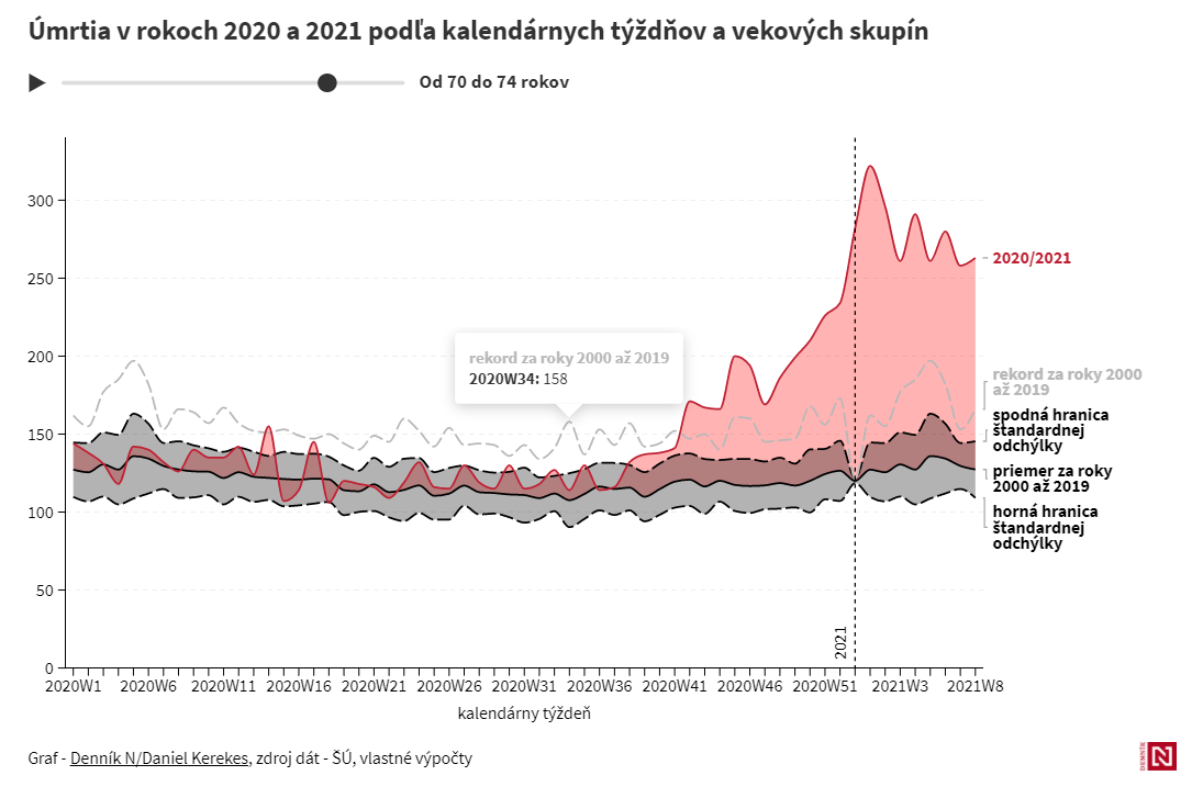 Vo veku 70-74 tyzdenne umiera asi 125 ludi pocas pandemie tedaposlednych 20 tyzdnov by som tem pocet odhadol 225 -230, vrchol mali 332. V podstate ja by som to nemusel ani odhadovat, su tam udaje vedel by som to aj spocitat. Ked budem mat cas tak si spravim skusku spravnosti.
