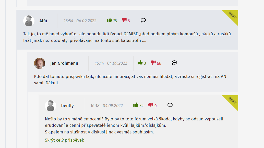 Inak ako na tom fore vyriesili trolov? Co prispevok 100 CZK.  Napisali X 3prispevky, Z 4 prispevky  Y 3prispevky.  1000 na ukrajinsku ambasadu. A prestali tam prispievat. A nereagovali na nich.